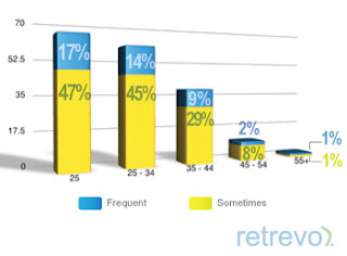 In any case, the Retrevo survey results are here for those interested. Among the more interesting parts of the blog post are breakdowns of respondents by response and the kind of phone they use, as well as their age (see graph at right). The most likely culprits among DWTers are smartphone users, particularly iPhone users and, of course, the young and the reckless. . .